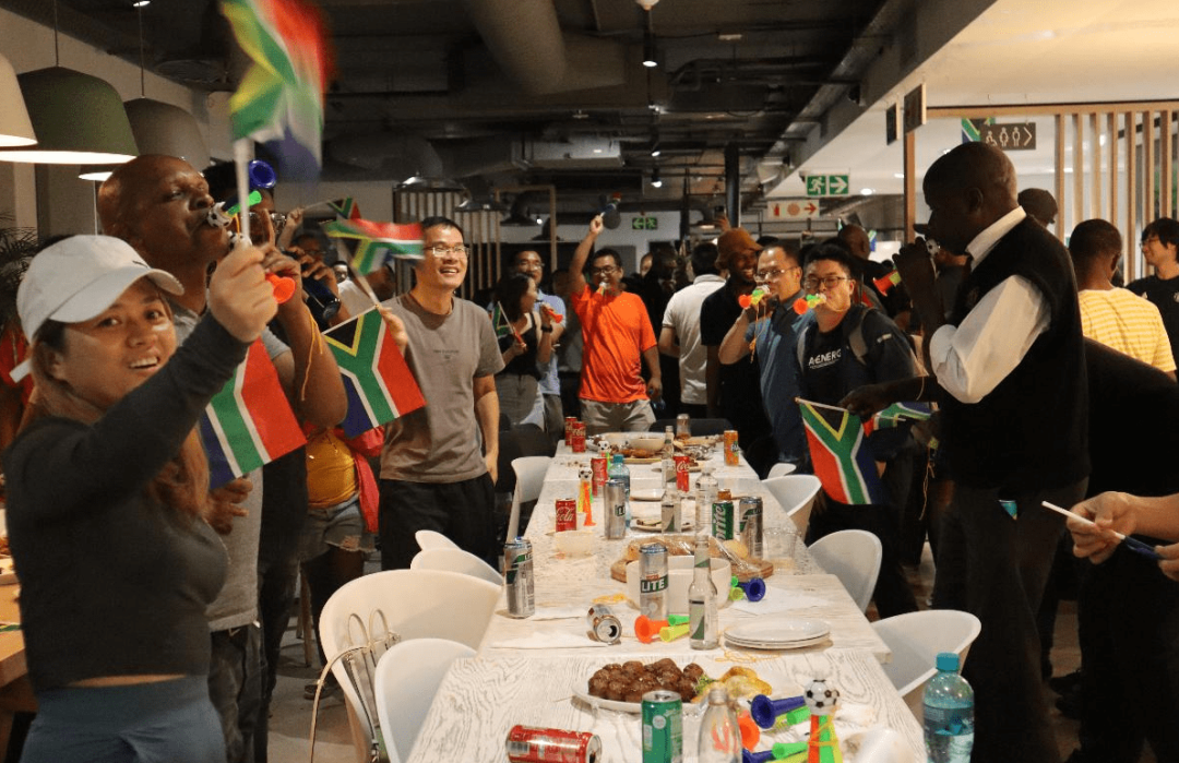 2023年10月,2023年橄榄球世界杯决赛在法国举行,南非队和新西兰队正面交锋,南非人民非常关注这场比赛。大家讨论后一致决定:把球赛搬进本地餐厅,现场直播!10月下旬,决赛信息公布后,我们联动IT团队准备了电子大屏和音箱,提前做好设备调试,并通知本地餐厅供应商准备好饮品和烧烤、披萨等当地美食。
