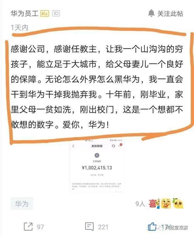 该员工不无感激地说:“感谢华为,感谢任教主(任正非,华为公司老总,大家都调侃为任教主),让我一个山沟沟里的穷孩子,能够立足于大城市,给父母和妻儿一个良好的保障!无论外界怎么黑华为,我会一直到干到华为抛弃我为止。10年前,我刚毕业,家里父母一贫如洗,刚刚走出校门,今天拿到了一个连想都不敢想的数字,爱你华为!”