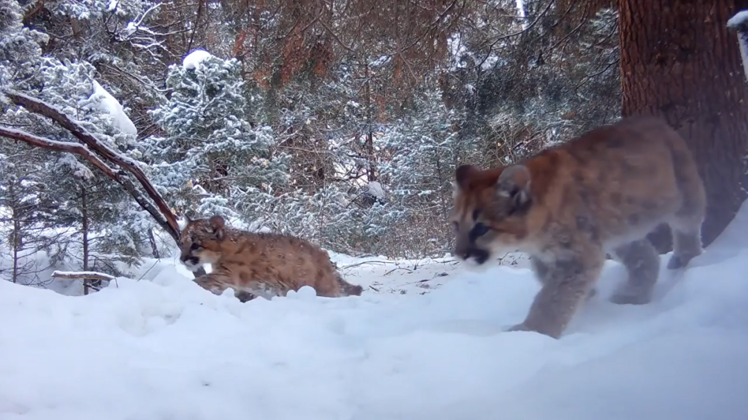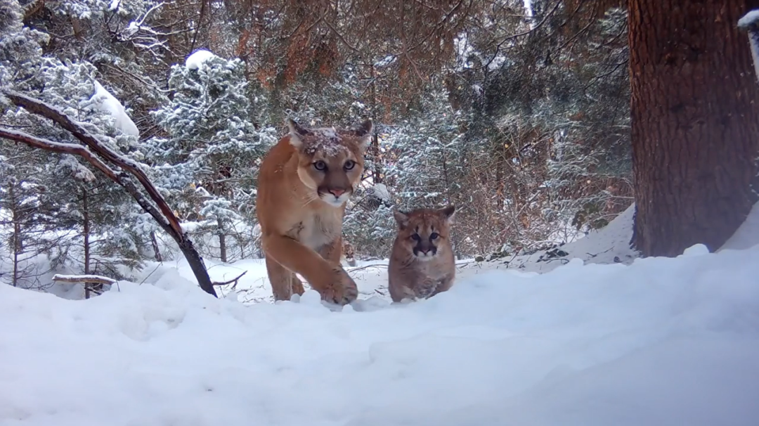 从Denise分享的照片可以看到,美洲狮宝宝们乖乖跟在妈妈身后,也许它们也知道,在寒冷的冬天,对于这个小家庭来说,团结一致才是最重要的~