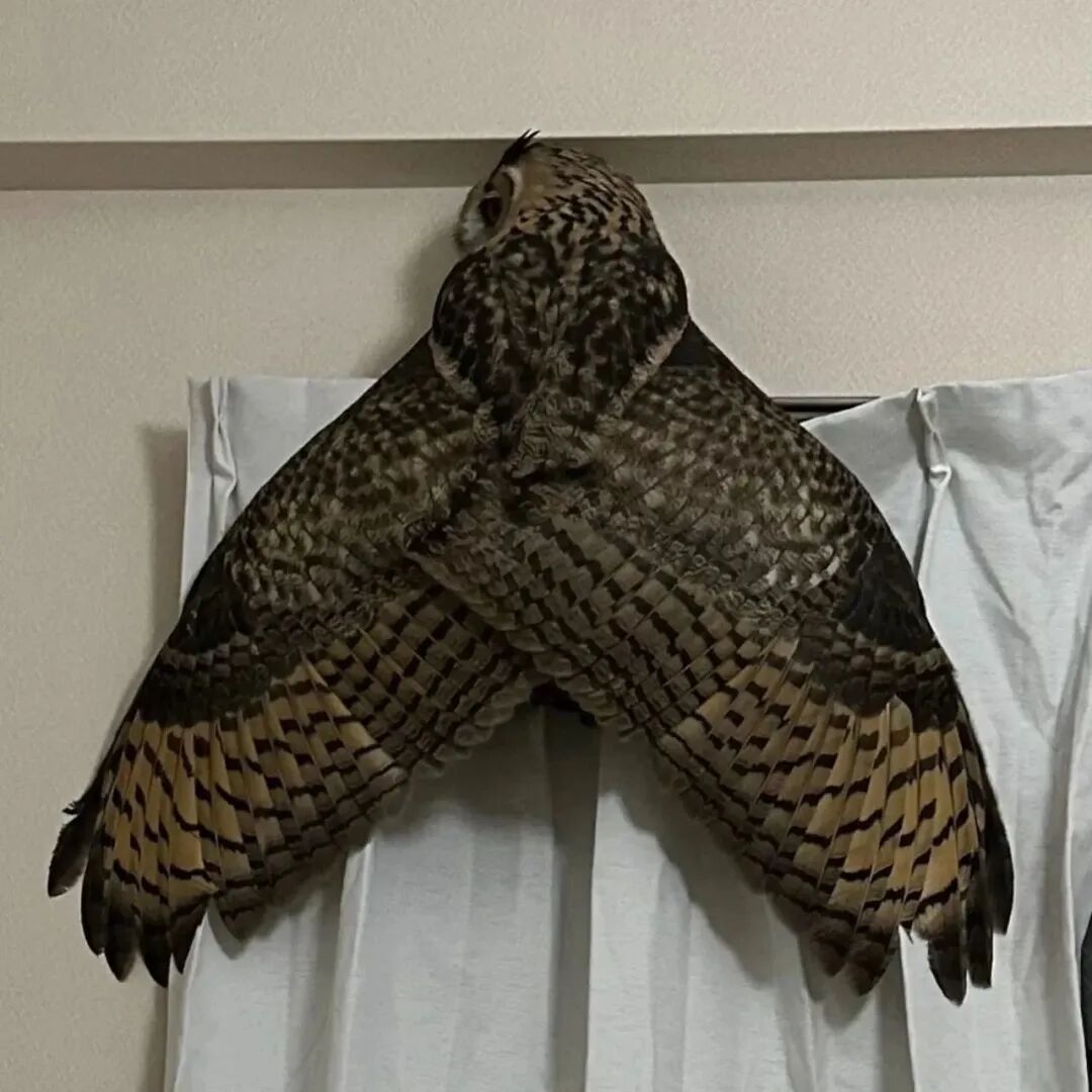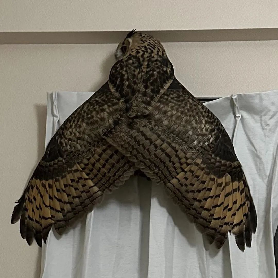 后来他定睛一看才发现,原来这只蝉根本就是自己饲养的宠物猫头鹰Kohaku(こはく),不知道为什么kohaku突然就飞上窗帘,它还趴在那边,翅膀张开的模样跟蛾和蝉几乎长得一模一样,连网友看了都笑出这东西根本就是半夜也会叫的蝉。