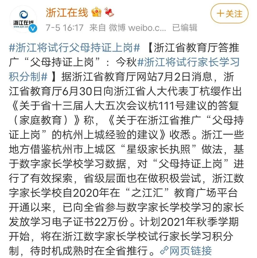 前两天看到一个新闻,浙江试行积分制父母“持证上岗”。