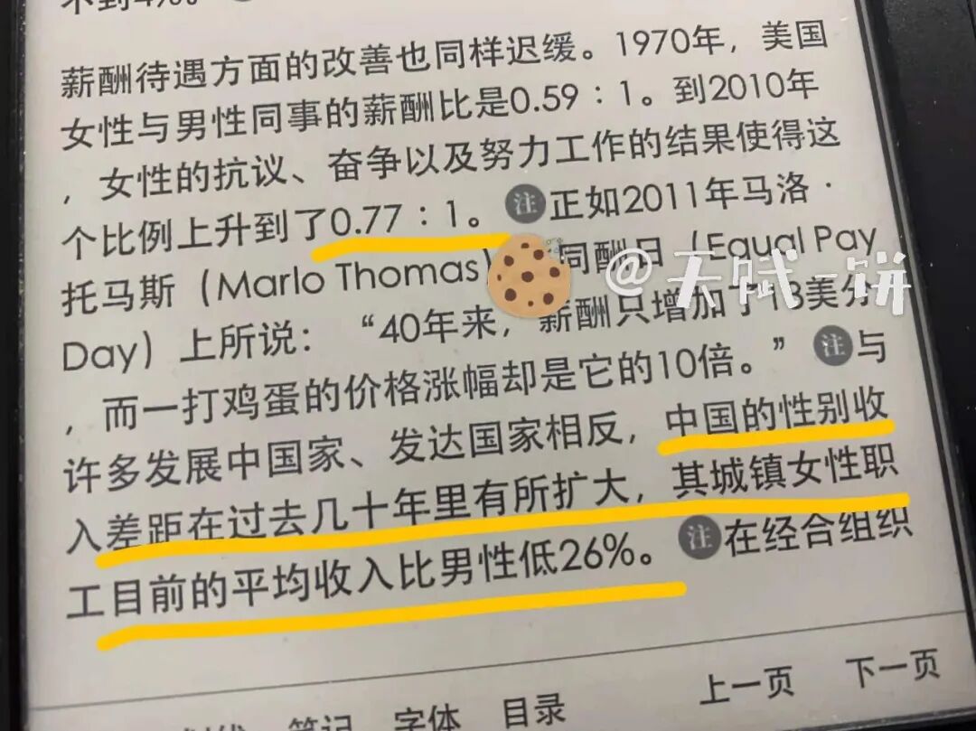 小桑在书中特别点名了中国,在其他国家男女薪资差距缩小的趋势下,中国的性别收入在过去几十年里有所扩大,女性收入比男性低26%。