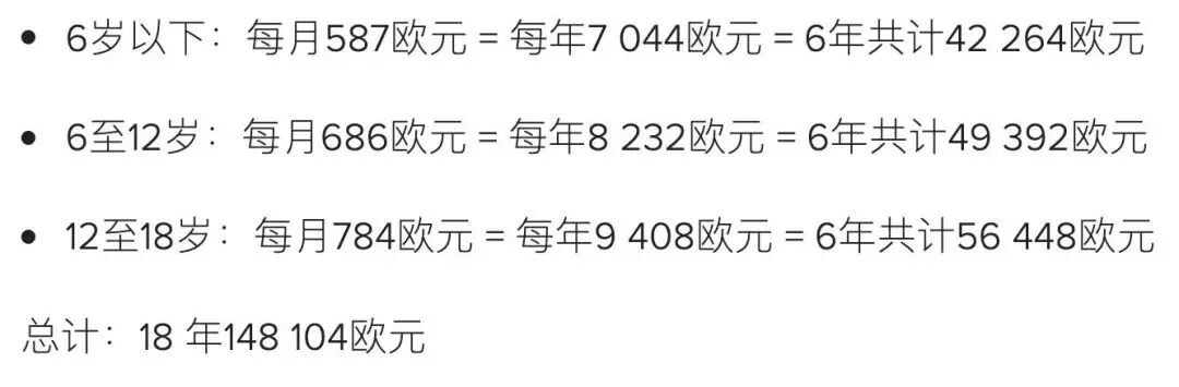 假设未来儿童金不再上涨(事实上一定会涨),三孩家庭25年内总共可以领到20万欧元(合140万人民币)的补贴。