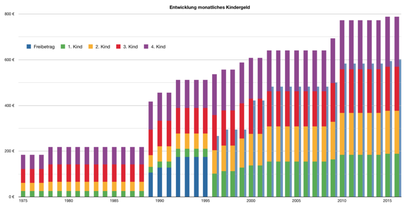 ▼ 德国自1975年的儿童金金额变化(绿色柱=1孩,橙色柱=2孩,红色柱=3孩,紫色柱=4孩)