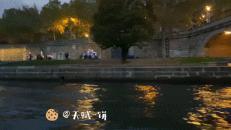 河岸上有人提着荧光棒在跑步,好像是什么长跑比赛,从白天就在跑了。