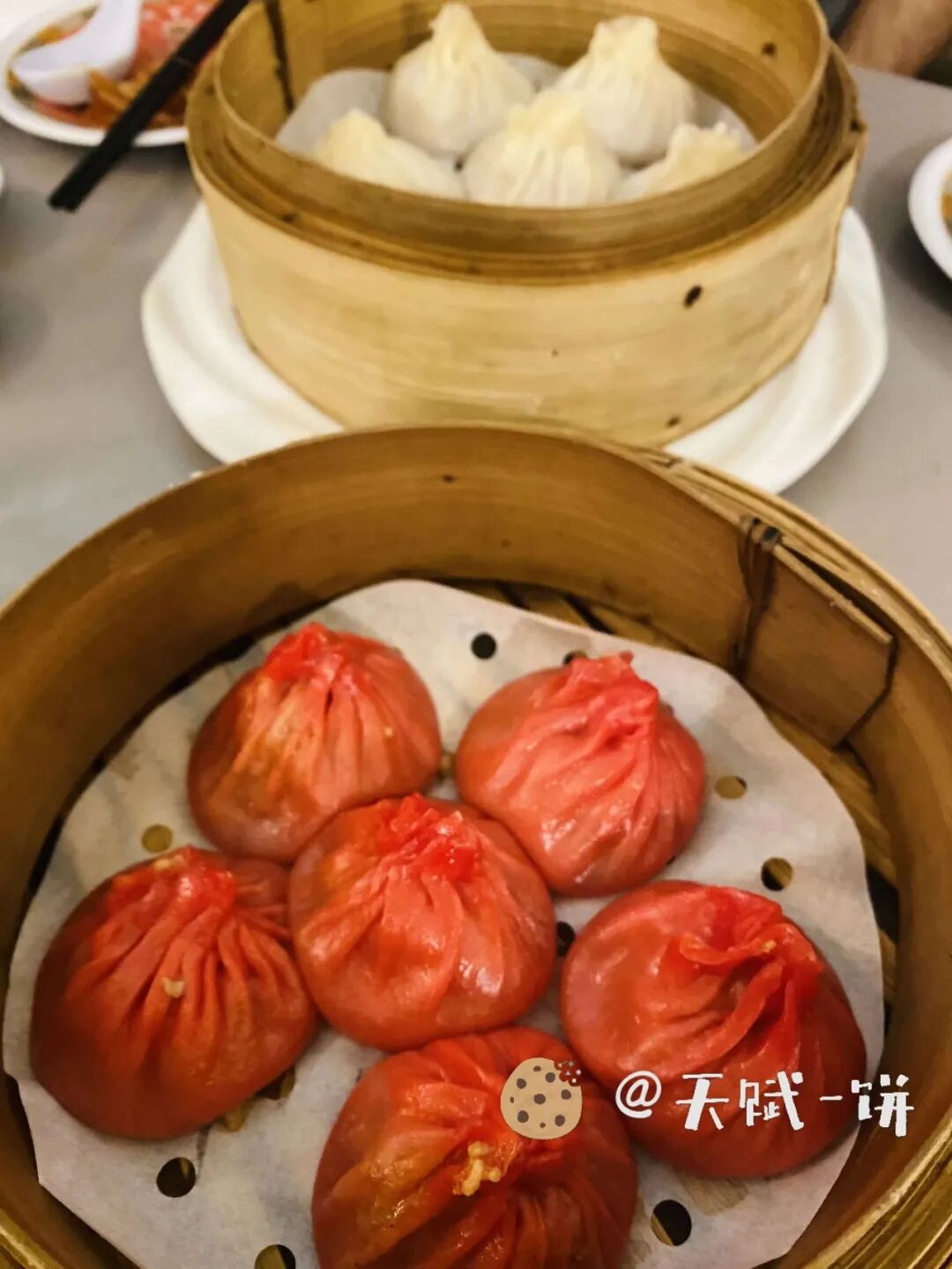 还去吃了小笼包,你们猜红色的里面是啥馅?