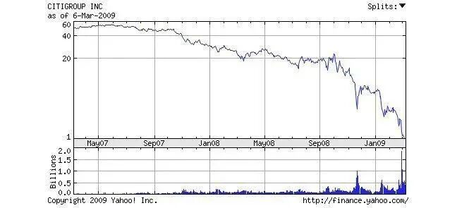 这不是个比方,而是2007-2008年的次贷危机中,花旗银行的真实股价走向。
