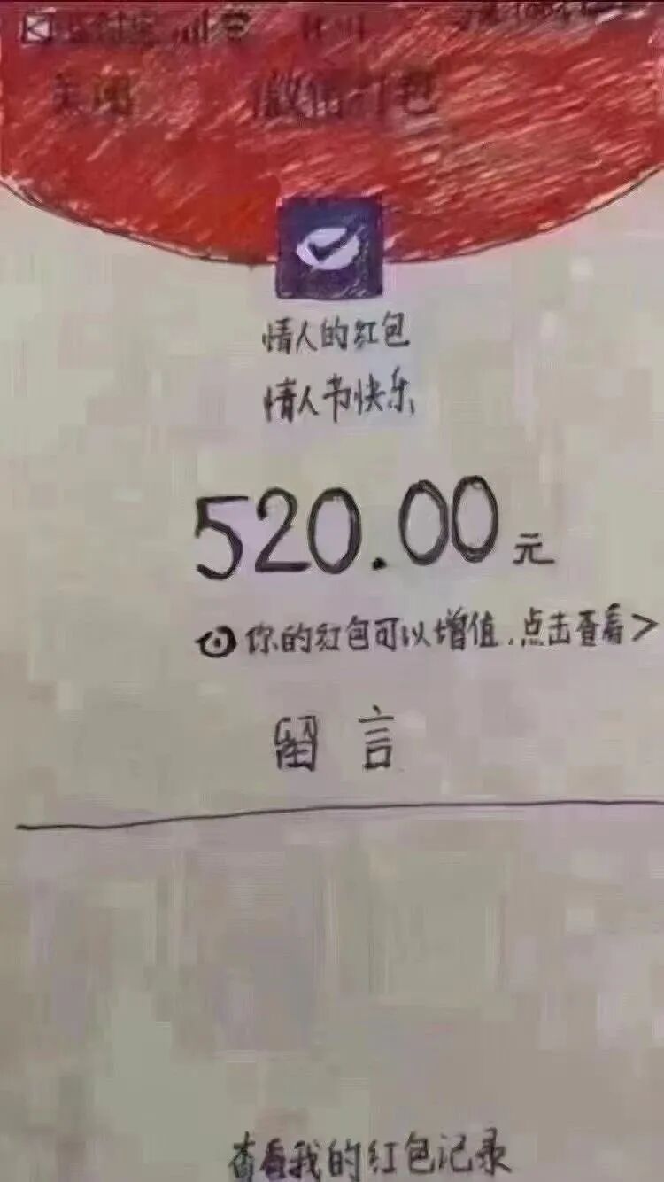 对了,今天不是520么,这是我队友今天早上发我的环保红包,也送给你们,保存图片就可以循环使用了。