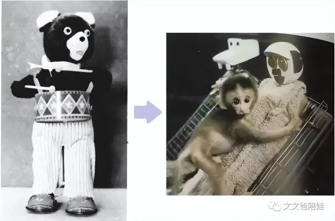 实验人员在小猴子的房间内,放置了一个只提供奶水的铁丝猴妈妈,跟一个不提供奶水的布偶猴妈妈,来观察小猴子的反应。