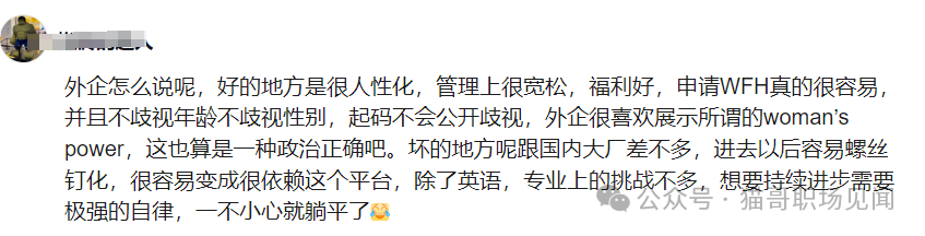 小王的感慨是个案,却也反映出外企员工职业发展的普遍难题。外企与国企相比,职级系统更为扁平,空间确实较大,但随着时间推移,各种不利因素也会暴露出来。外企注重短期业绩,员工需要承受较大的业务压力。