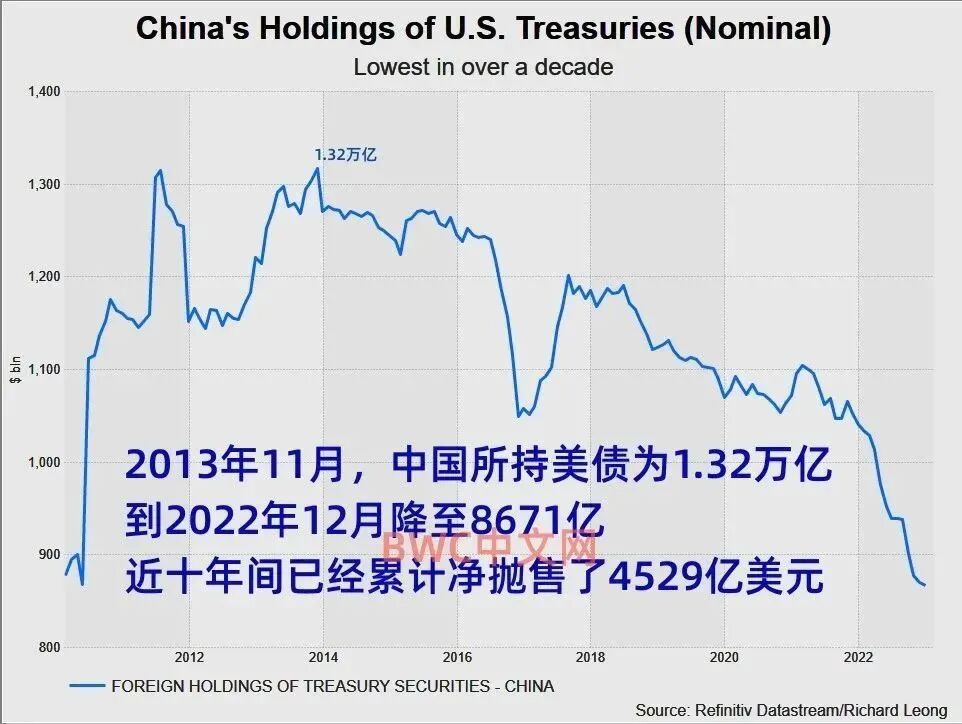 与此同时进行的是,据路孚特公司最新监测到的数据显示,截至2月份,的一年多时间内,中国也大幅度清算了高达17%仓位的美债,且在2022年有11个月均呈现出净抛售美债的状态,仅有一个月只象征性的小幅增持了4亿美元,使得持仓更是加速降至十二年以来的新低,与2013年11月中国所持有的1.32万亿的美债峰值相比,更是净抛售了高达4529亿美元的美债。