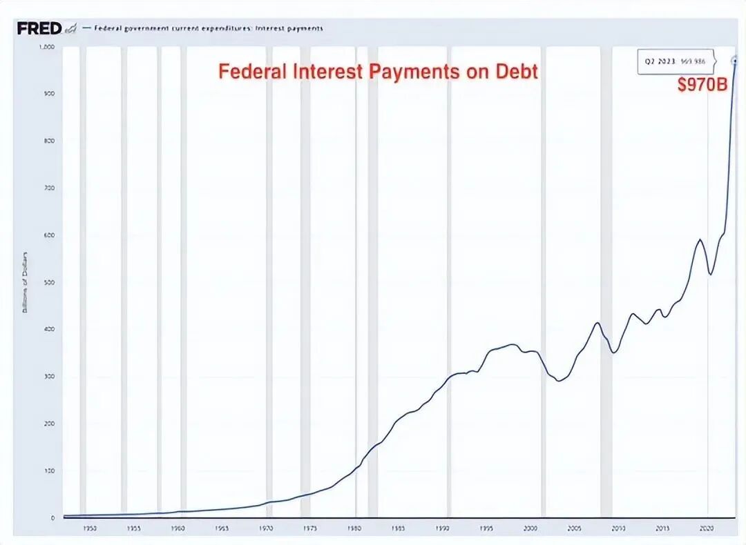 如果美国债务在2024年底达到38万亿美元,那将意味着美国每年为此支付的利息将达到惊人的2万亿美元,美国国会预算办公室在1月25日发布的最新债务预测表明,美国联邦债务负担将在2052年达到GDP的189%,美国债务将达到50万亿美元,其中,债务利息成本增加最快,然后呈指数级增长,直到美元最终崩溃。