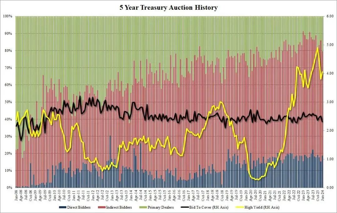 1月30日,就在市场进一步增强美联储降息的期望和红海局势持续升级影响供应链之际,美国财政部拍卖的总额高达350亿美元的5年期美债遇冷,惨到无人问津。这预示美国财政部接下去在2月至4月期间进行更大规模的发债计划会很不稳定,投资者将会要求更高的溢价。