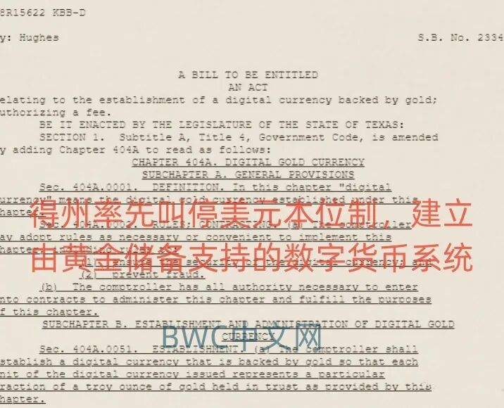 他们在提案中进一步说,州当局将确保拥有足够多的黄金,以赎回所有已发行但尚未赎回为黄金或美元的数字货币单位,金本位将防止美国不负责任的消费习惯和凭空创造美元,以挽回美元对美国稳健货币系统造成损害后的信誉损失,这表明,得州正在为实行新的金本位制铺平了道路,其他州也可以效仿得州的做法。