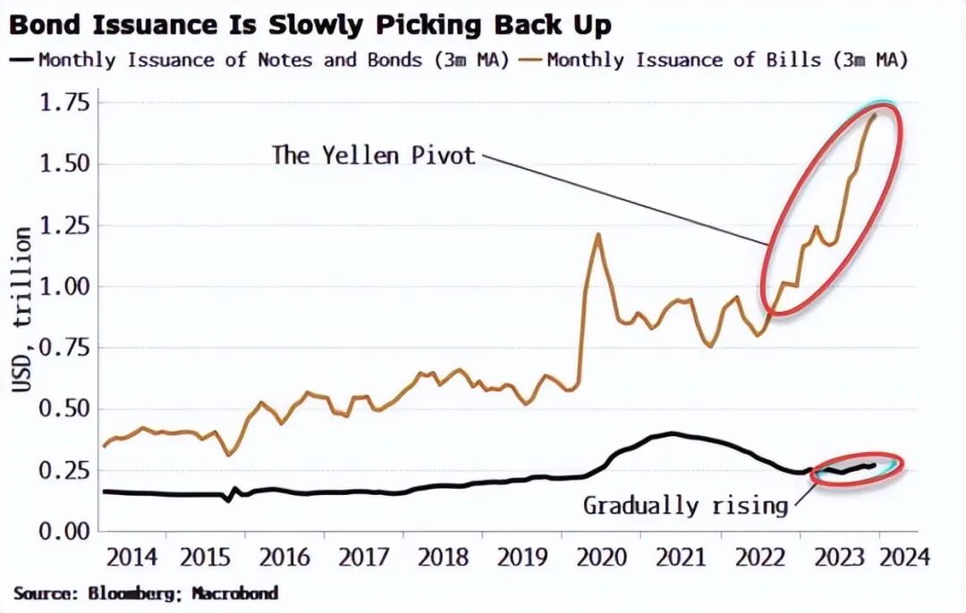 对此,美国金融网站ZeroHedge分析称,虽然,美国财政部的融资规模意外下降,但其票据已经达到政府债务规模的122%,据美国财政部的最新公告统计,截至1月28日,美财政部已经累计宣布将发行1.05万亿美元的新国债发行计划,分析表明,其最终可能需要在2024财年发行总额高达2万亿的美债才能平衡其支出和偿还债务利息及相关款项。