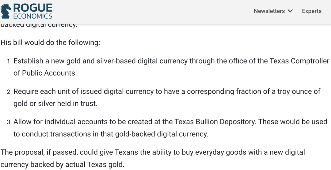 他们在草案中提到的实际运作方式为,美国民众将从得州当局购买数字货币,然后,州当局将用这笔钱购买黄金。然后,再把这些黄金存放在得州的金银库中,这意味着得州的人们可以直接获得他们的黄金。这也意味着,由黄金支持的数字货币得到广泛接受。