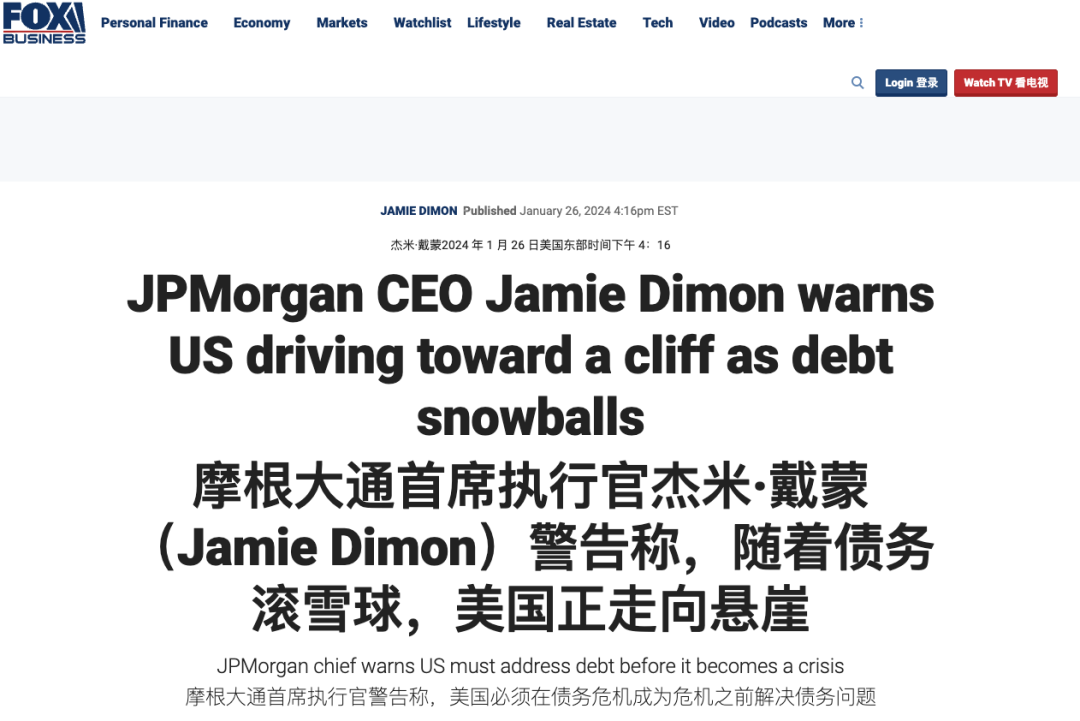 对此,摩根大通首席执行官杰米·戴蒙在1月27日警告称,随着美国债务滚雪球和失控的债务持续增加,美国正在走向悬崖,大约10年后,我们将以每小时60英里的速度朝着这个目标前进,并警告美国财政部必须在债务演变成危机之前解决债务问题。
