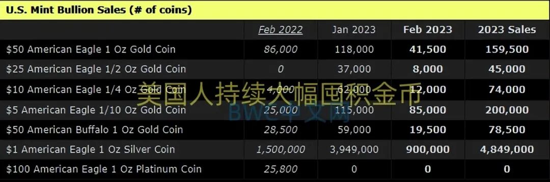 截至3月19日,美国越来越多的储户正在持续从银行中提取现金,以防止出现类似于硅谷银行的意外。全球金融服务咨询公司Patomak Global Partners 副总裁兼前共和党货币审计长基思·诺雷卡 (Keith Noreika) 表示:“美国人实际上正在四处转移资金,所有这些银行将在三个月、六个月后看起来完全不同。”与此同时,如下图,美国铸币局反映的数据显示,美国人在过去一年间,持续大幅囤积金币。