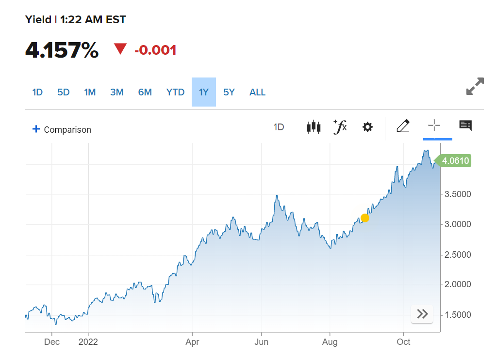 就以美国国债为例,如下图,作为全球资产定价之锚的10年期美国国债收益率一年间的涨幅约为3%,目前达到4.15%的水平区间,也是2008年金融危机以来最高水平位置。美债收益率与价格和持有情况反比走势,收益率越高,说明美国国债跌幅越大,抛盘越猛烈。这也表明,美联储这场以抑制美国通胀为名的史诗级的加息缩表,似乎正在收割美国国债的利差。