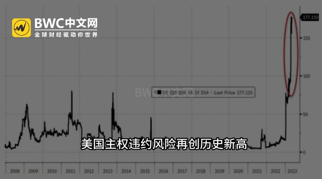 并且1年期美国信用违约互换(CDS)交易价格已达到176个基点,创下历史最高水平,甚至超过了2011年8月的水平。这表明投资者对于美国触发违约变得更加紧张。
