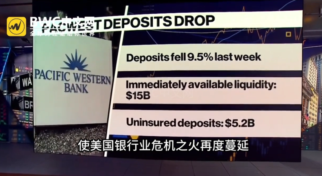 与此同时,伴随美国债务僵局持续,今年3月以来,美国的银行业危机也非常巧合地相继上演。事情的新进展是,美东时间5月11日,濒临破产边缘的西太平洋合众银行(PacWest Bancorp)发布的报告显示,该行上周存款流出了约9.5%。这家银行的股价本月一度跌至创纪录低点。这使美国银行业危机之火再度蔓延。美国多家中小银行的股票本周再次陷入抛售潮,集体暴跌。