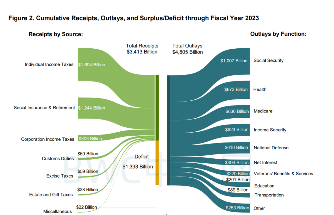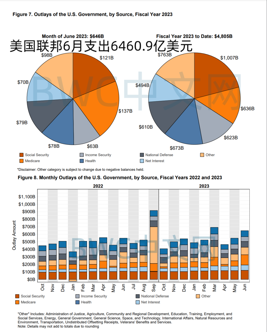 而根据美国财政部的月度报表,美国联邦6月赤字为 2277.7 亿美元,使 2023 财年财政赤字总额已达到1.393 万亿美元。也就是说,在距离9月30日结束的美国本财年还有三个月时,2023 财年的预算赤字就已经超过2022财年全年预算赤字的1.375 万亿美元。