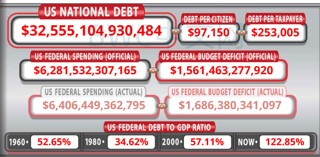 因为对于美国的顶级银行家们来说,通过美元资本的货币举措在印度等市场收割的利差财富似乎比美国国内自身控制债务赤字以及降低预算要容易得多。而截至7月18日,美国国债时钟显示,美国联邦债务总额已经高达32.55万亿美元,自6月暂停31.4万亿美元债务上限以来,仅用了一个半月,美国的债务总额就飙升了1.15万亿美元。