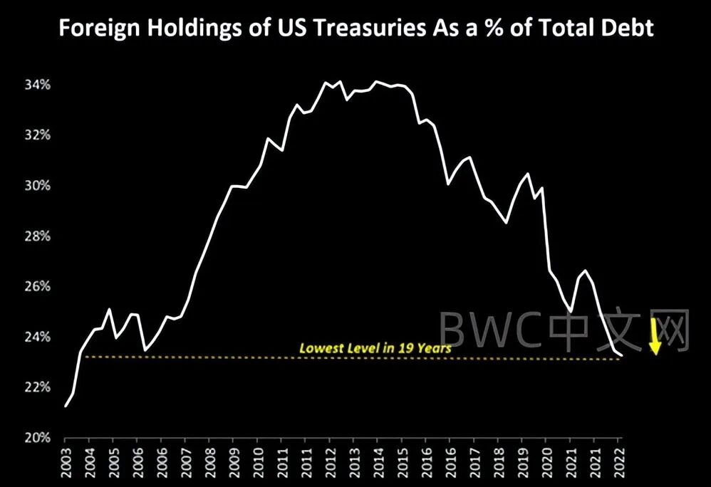 与此同时,通过下图,可以看到,多年来美国债务不断膨胀,但外资持有量占美国联邦债务总额的比例已从2014年的33%下降至5月的不到24%。这意味着,美国国债正在不断失去全球流动性。也是美国银行业危机的深层幕后推动力。