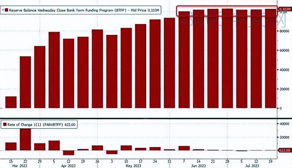 同时,美联储银行定期融资计划资金的使用量再次徘徊在 1030 亿美元的历史高位附近。这说明,始于3月的美国银行业危机还远没有结束,继硅谷银行,签名银行,第一共和银行相继倒闭后,美国更多的银行正在因资金不足陷入困境,并寻求纾困。