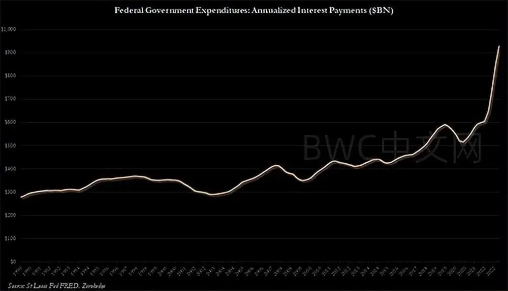 而根据圣路易斯联储的数据,美国联邦支付的利息现已首次超过9000亿美元,并且在一个季度内可能会突破1万亿美元,这一历史性基准或将很快迎来美国经济的明斯基时刻。
