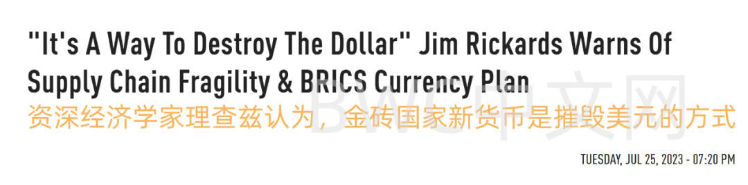 不仅于此,根据资深经济学家吉姆.理查兹7月25日的分析,金砖国家黄金加权货币可能会在8月中旬到月底这段时间被正式宣布发行。而这一全新的货币形式目前已得到至少41个国家的支持,预计将占全球经济总量的至少三分之一。理查兹称, 这是美元的竞争对手,也是摧毁美元的一种方式,美元即将面临崩溃。
