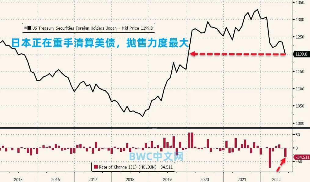据美国财政部在7月19日最新发布的国际资本流动报告显示(美债数据报告会有两个月的延迟惯例),日本在5月继续大幅度抛售304亿美债至持仓1.096万亿,且在全球央行中抛售力度最大,抛售规模创下去年10月份以来最多,我们注意到,截至5月的12个月内,日本已经共净抛售了1231亿美元的美债,估计,在接下去,日本央行为捍卫日元和日本国债收益率还将会持续抛售美债。