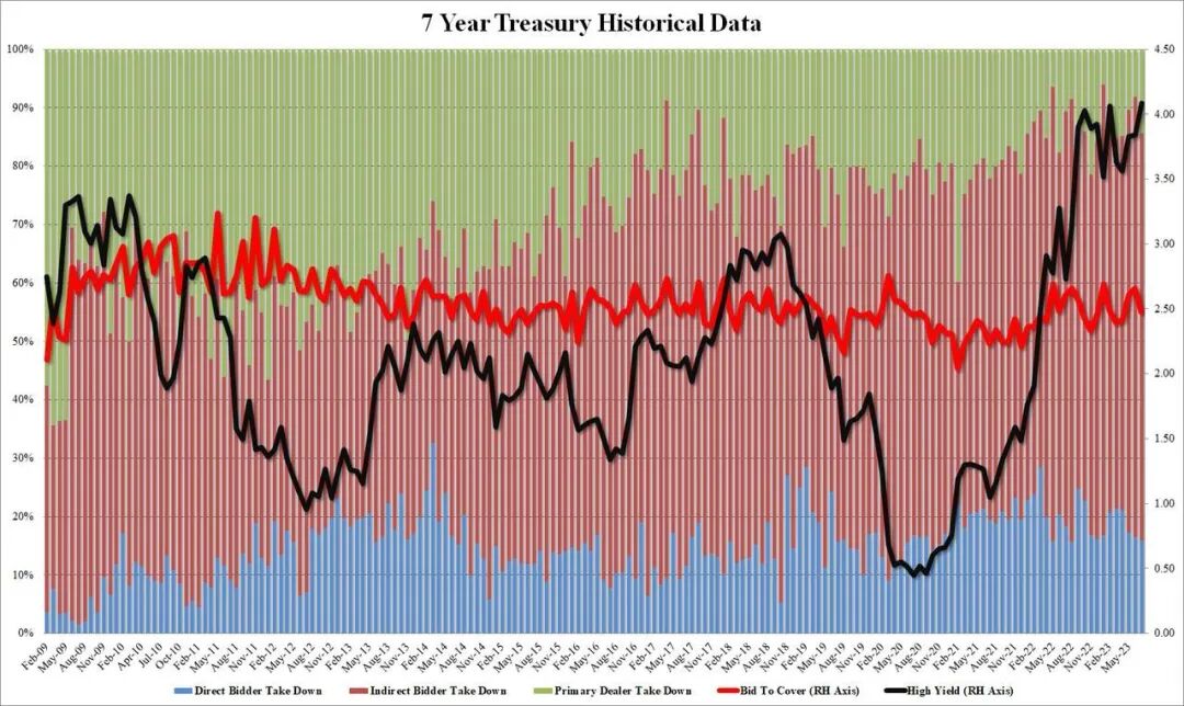 这些都预示美债面临的最大尾部风险,将经历更多动荡,这也使得美国财政部在7月28日举行的350亿美元的7年期美债拍卖创下历史纪录的惨淡交易数据(具体细节请参考下图),且这是继本周另外两场3年期和5年期美国国债的惨淡拍卖之后的另一场糟糕的拍卖,但对美债来说最坏的情况还不止于此。
