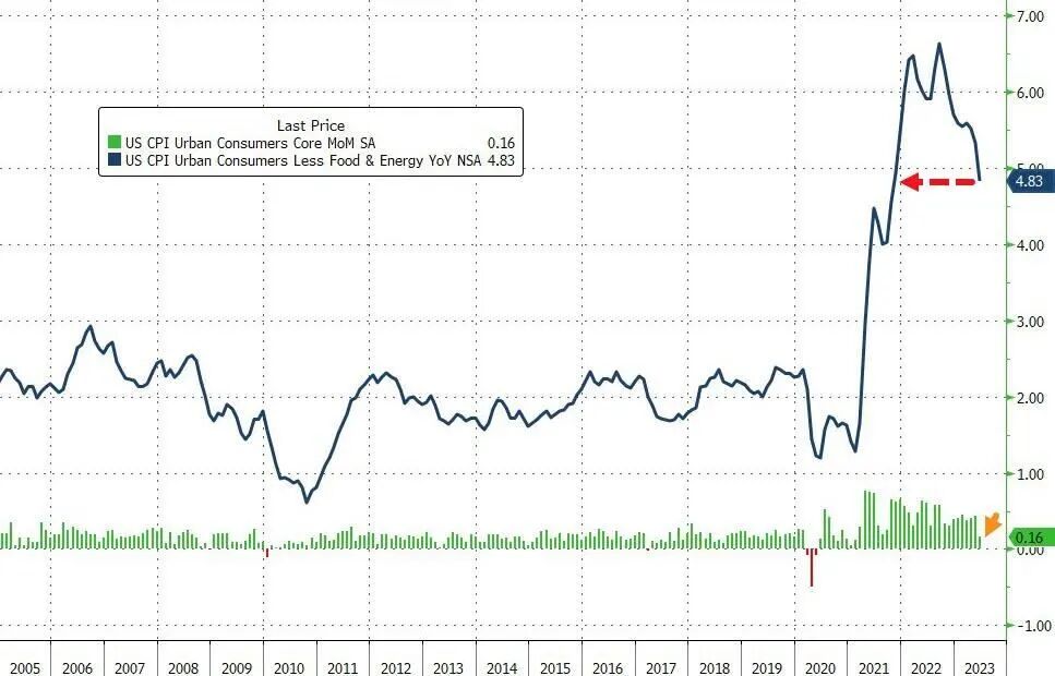 不仅于此,美联储通过11次加息已经将把基准利率升至5.25%-5.5%,但经最新的月度核心通胀率(4.8%)调整后仍无法使得美债实际收益率转为正值,随着高于基准债券名义收益率的通胀持续,实际收益率将持续跌入负值区域。