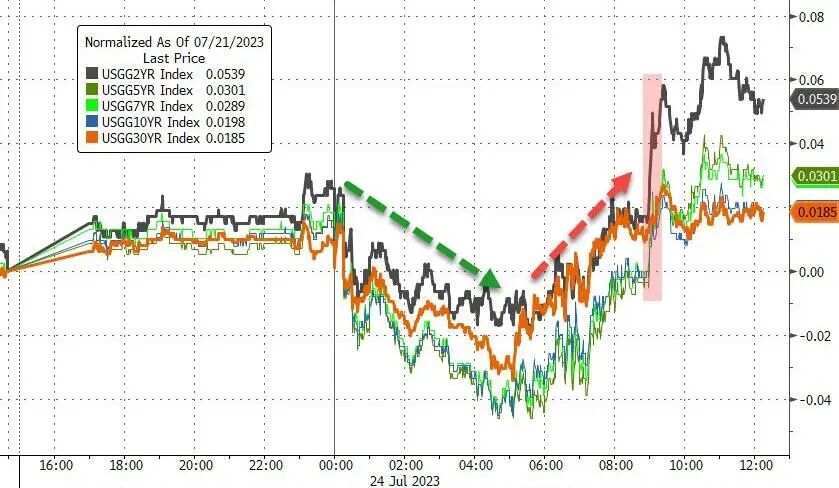 7月28日,美债收益率大幅上涨,被市场抛售,尽管美联储在27日如期加息25个基点,向市场摊牌今年不会降息,且在过去一年半激进式的收紧货币政策,但一系列数据显示美国经济基础总体稳固,这使得美国两年期、七年期、10年期的国债收益率均创下两周以来新高。