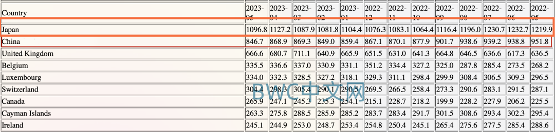 数据显示,中国也在5月抛售了222亿美债,这是继4月抛售4亿美债后的再次大幅抛售,且保持了连续14个月持仓低于象征性的万亿美元的状态,这其中,仅过去的24个月内中国就加速抛售约占24%仓位的美债,而在过去十年中,中国已经降低了35%的美债持仓,约4700亿美元,目前中国为第二大海外美债债主,具体数据细节请参考下图。