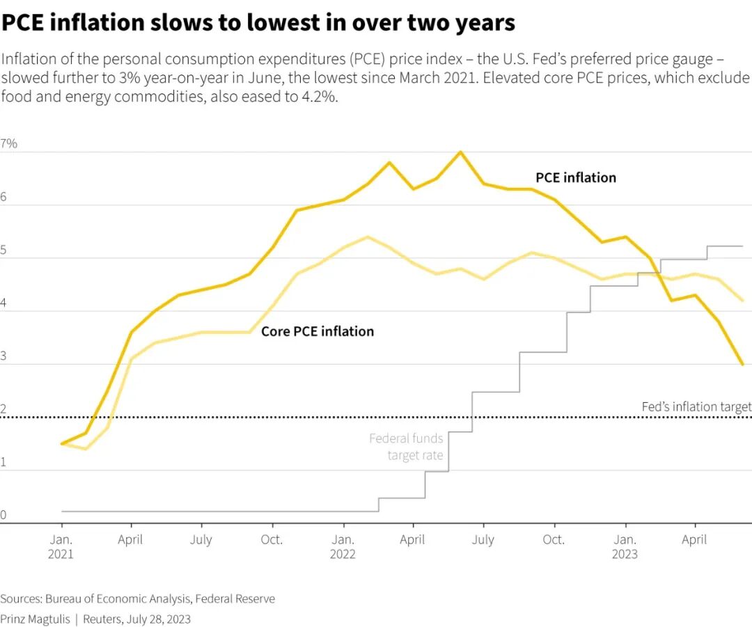 美国7月29日公布的核心通胀数据显示降温新迹象,作为美联储首选的通胀指标,美国6月核心PCE物价指数同比增长4.1%,低于预期,但在一系列经济数据表现强劲和市场忽略日本央行鹰派突袭后,市场对美联储在更长时间维持高利率和美国不会陷入衰退的预期升温,使得指标十年期美债收益率一度回落10个基点,但全周仍升超10个基点,显示资金流出美债市场。