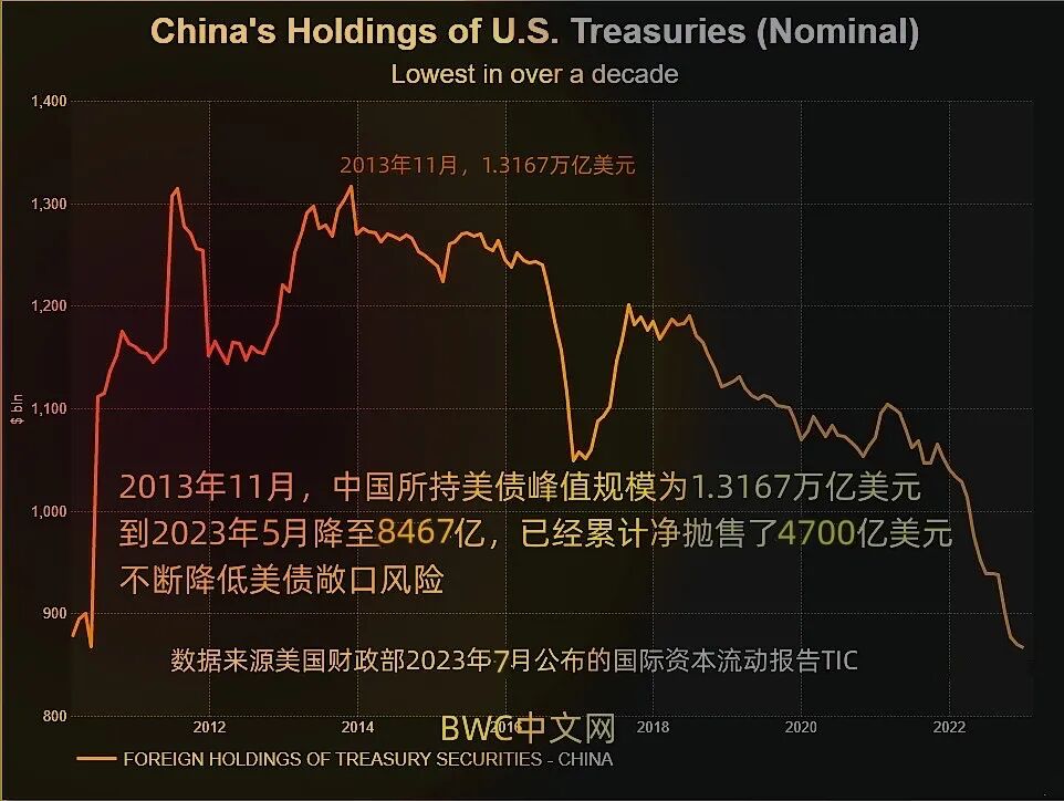 据美国财政部在7月19日公布的最新国际资本流动报告数据显示,目前,中国持有的美国国债仓位正在持续下跌,在过去十年,中国持有的美国国债仓位减少了35%,和2013年的1.3167万亿峰值相比净抛售清仓了4700亿美元的美债,截至5月,中国持有8467亿美元的美国国债,为2009年以来的最低水平,且连续九个月保持了持仓低于9000亿美元的规模,且从去年开始清算美债的速度明显加快,仅去年就清仓了占23%比例的美债。