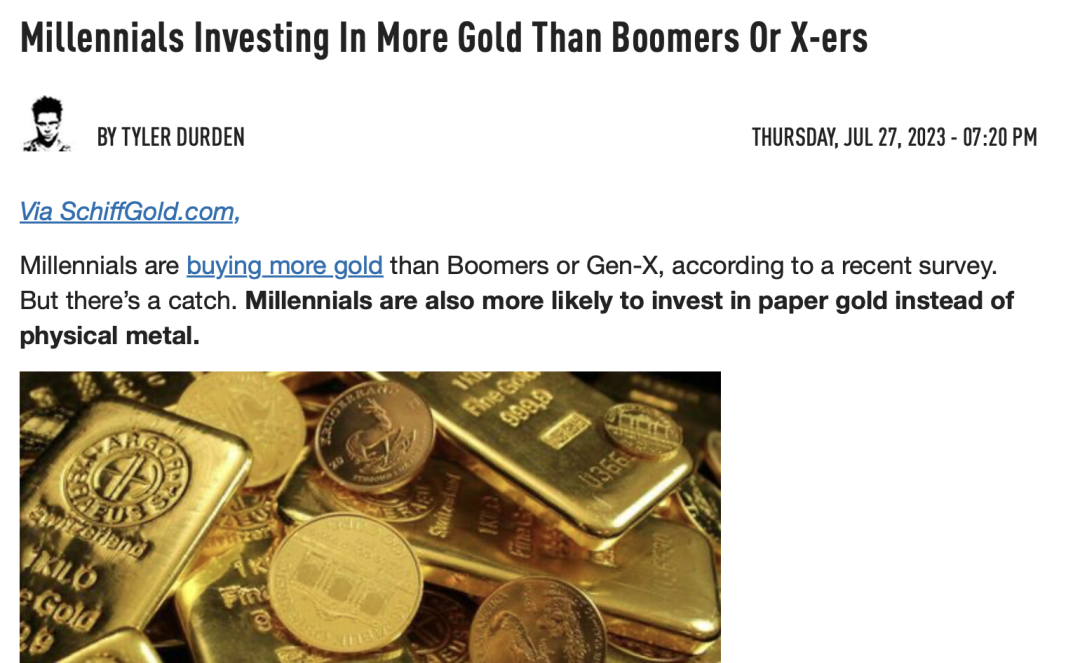 所以,这也就解释了为什么会有国会议员提出可以用一枚万亿美元的金币来向中国偿还债务的背后原因了,更让现在越来越多的美国人正从银行取出存款,特别是美国的千禧一代比婴儿潮一代或X一代购买了更多的黄金,开始置换黄金和囤积金币(具体报道细节请参考下图),以应对美国可能会有更多银行倒闭和评级被下降后出现的金融市场动荡等不确定性风险,以表达对美国金融系统稳定性的质疑,可见现在美国的债务系统的危机之深,而惠誉只是对美国金融系统开了第一枪。