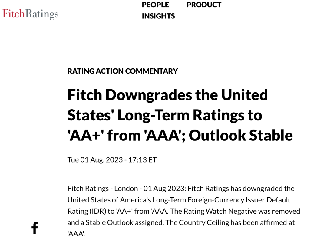 此次是惠誉自1994年首次发布美国信用评级以来第一次对该国的评级下调。另外,美国的一些保险公司和银行, 还有美国市政债券也将会面临评级下调的压力。