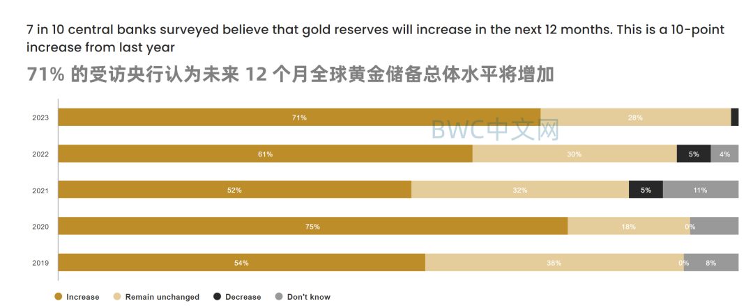 与此同时,根据世界黄金协会的报告,2022 年全球央行黄金购买总量为 1,136 吨。这是自 1950 年以来净购买量的最高水平。也是全球央行连续第13 年净购买黄金。而今年上半年全球央行的黄金净购买量仍达 387 吨,为有该记录以来的最高水平。世界黄金协会发布的2023年调查显示 ,71%的受访央行认为未来 12 个月全球黄金储备总体水平将增加,这比去年增加了 10 个百分点。