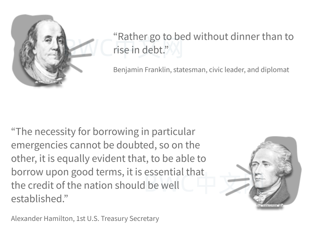 尽管美国的开国元勋之一本杰明·富兰克林曾说,“宁可不吃晚饭就睡觉,也不要负债累累。” 美国第一任财政部长亚历山大·汉密尔顿也曾表示,“在特殊紧急情况下借款的必要性不容置疑。同样明显的是,为了能够以良好的条件借款,必须建立良好的国家信用。”但过去200多年间,美国的国家债务就像滚雪球一样,愈发膨胀。