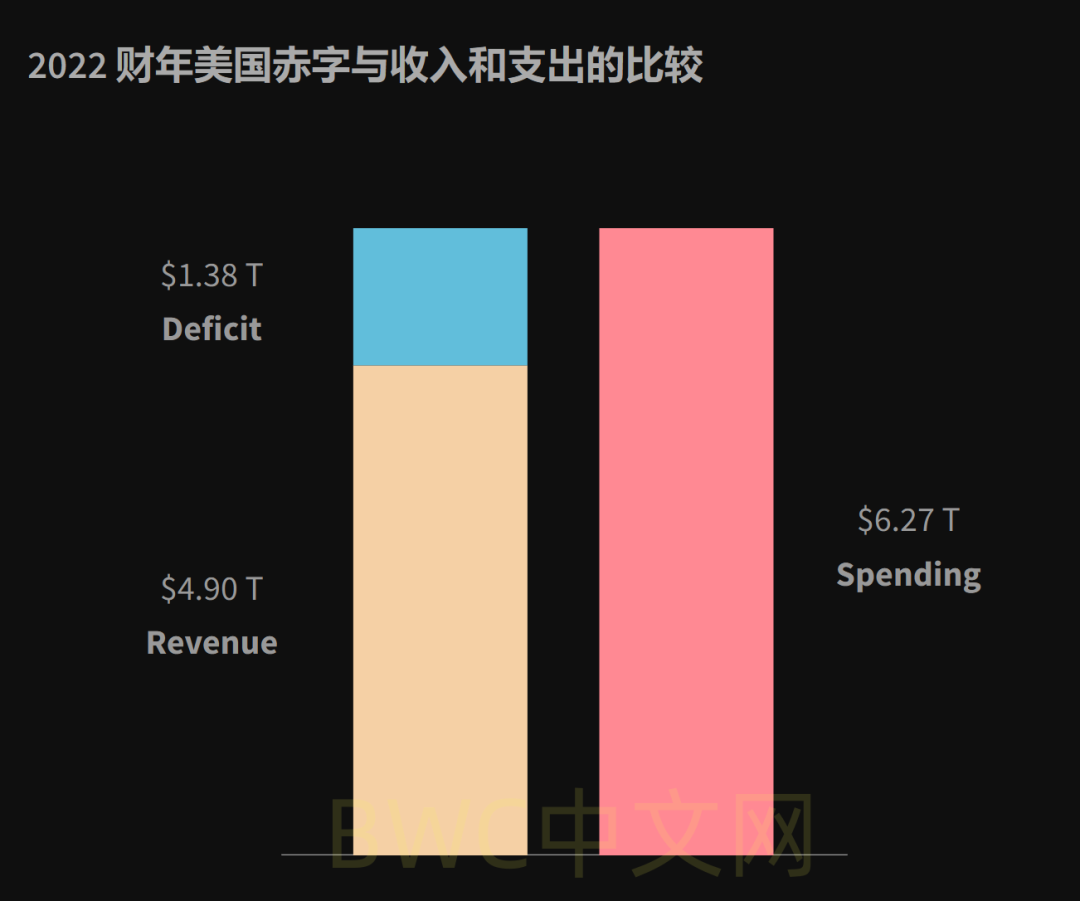 很明显,当美国联邦的支出超过收入时,就会出现赤字。这也说明,美国联邦实际上处于入不敷出的状态。与此同时,根据下图,可以看到,2022财年美国联邦支出为6.27万亿美元,而收入为4.9万亿美元,预算赤字总额约为1.38万亿美元。也就是说,在截至今年7月的本财年前10个月,美国联邦1.61万亿美元的赤字额已经比2022财年12个月多出2300亿美元。