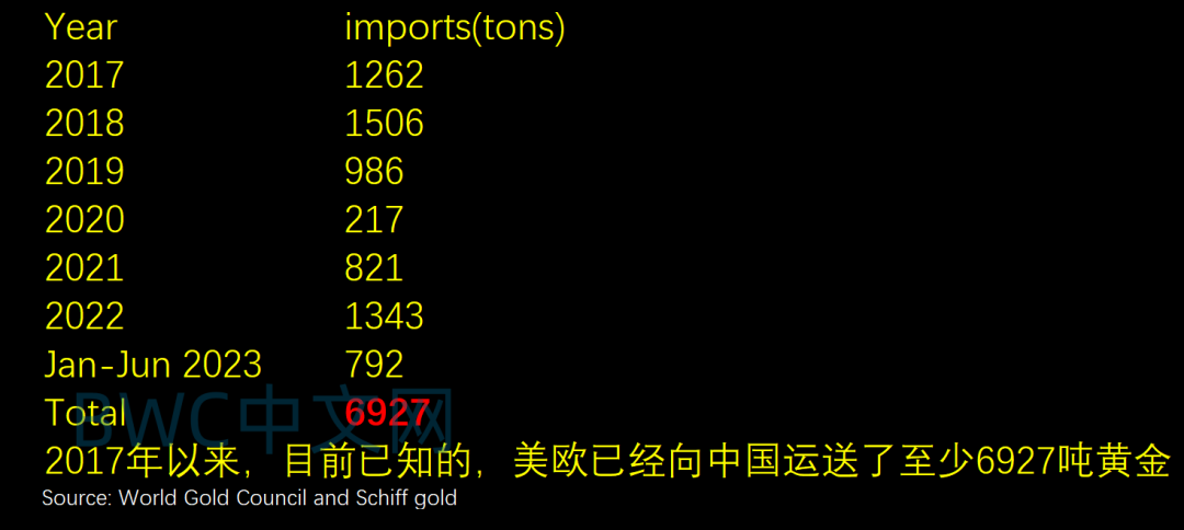 值得一提的是,根据世界黄金协会8月9日公布的最新报告显示,中国6月黄金进口量为98吨,今年上半年中国黄金进口总量达到 792 吨,较 2022 年上半年大幅增加400 吨。而根据下图,可以看到,自2017年以来,仅从进口层面,至少高达6927吨黄金已从美欧等海外市场运抵中国。