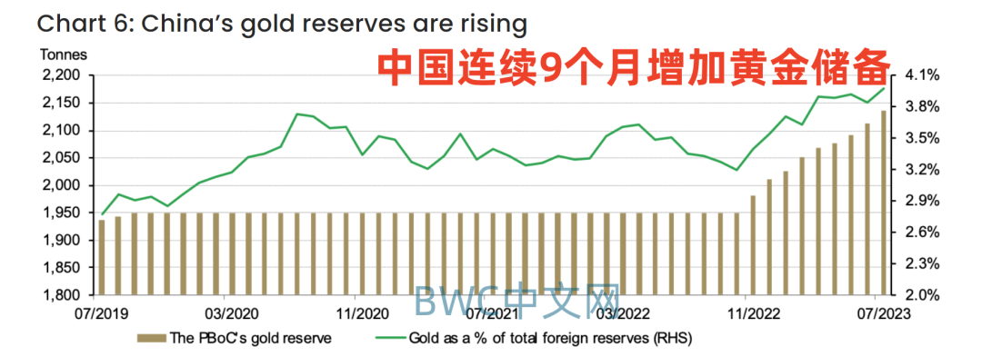 与此同时,在黄金储备层面,自2022年11月至今年7月,中国连续9个月共增加约188吨黄金储备,使黄金储备达到2136.5吨。打破了自2019年7月以来,连续40个月黄金储备保持在约1948吨持平的状态。