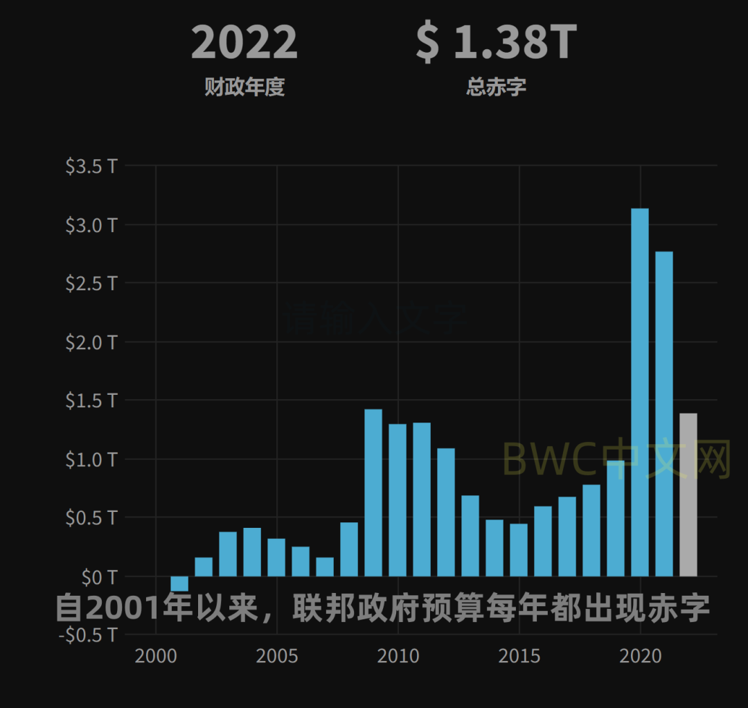 自2001年以来,美国联邦预算每年都出现赤字。从2016年开始,社会保障、医疗保健和联邦债务利息支出的增长超过了联邦收入的增长。为了对冲巨额赤字,美国财政部就不得不通过出售美国国债、票据和其他证券来借钱。由于联邦经常出现赤字,美国的国家债务总额就会增加。久而久之,滋生了美国联邦认为欠全世界债似乎理所当然。