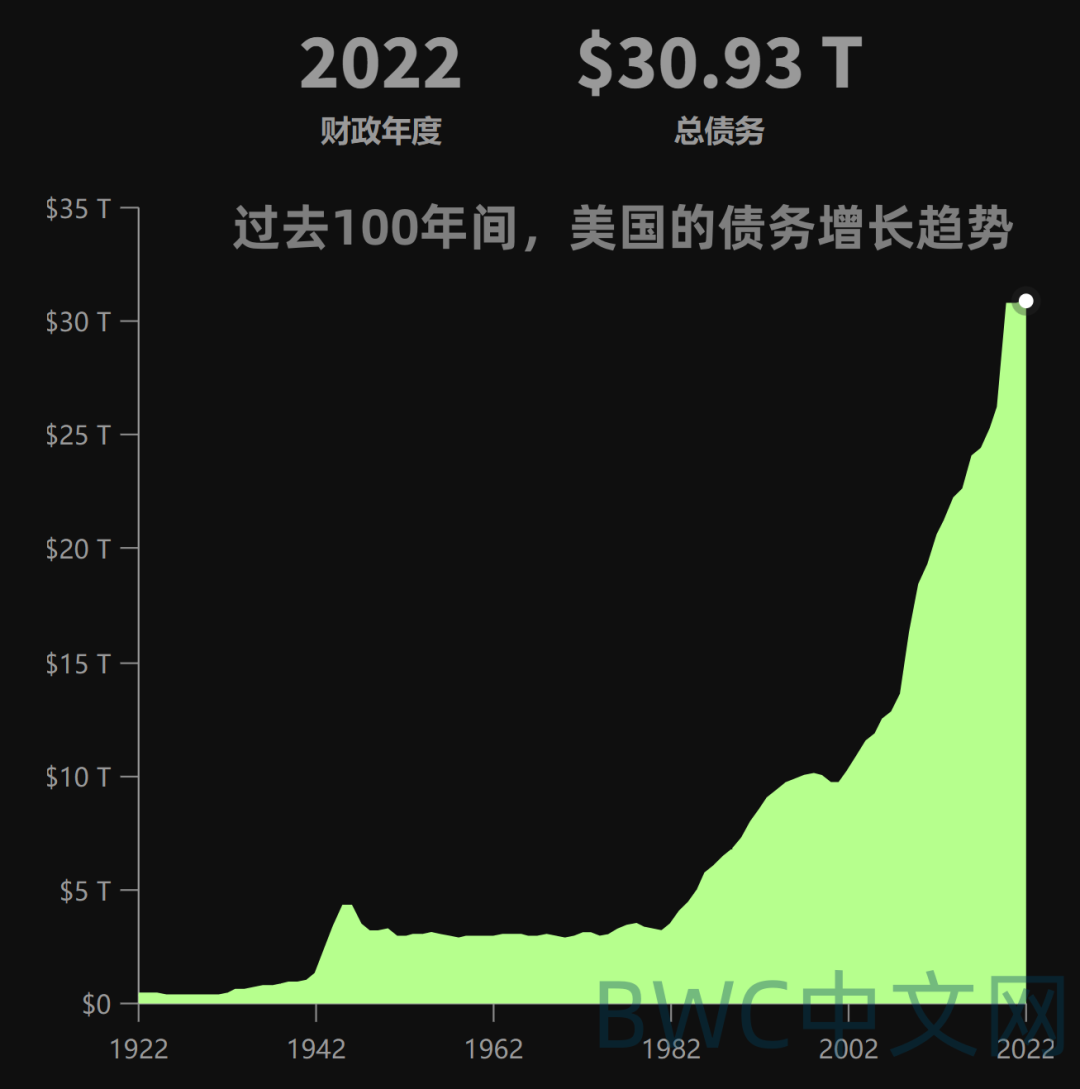 通过下图,可以看到,自20世纪20年代以来的100年间,美国联邦债务的增加程度由1922年的 4008 亿美元,增加到2022年的30.93 万亿美元。除了上世纪40年代二战期间美国联邦债务呈现陡然上升状态之外,1945年至1970年代之间,美国联邦债务总体保持在2.5万亿美元的水平区间。