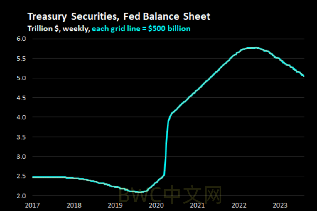 这也是自今年3月以来,包括硅谷银行在内,已有美国的5家银行倒闭后,美国银行业信任危机的最新预警。反过来,又将对负债累累的美国经济带来金融伤害。雪上加霜的是,作为美国国债最大持有者,美联储持有的美债规模已降至5.05万亿美元,为2021年5月以来的最低水平。