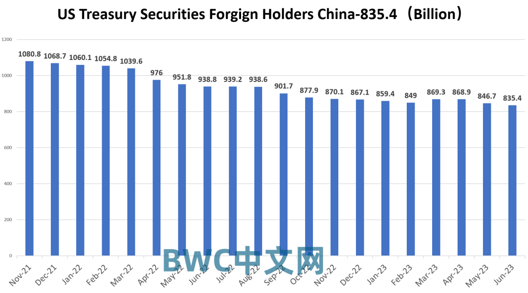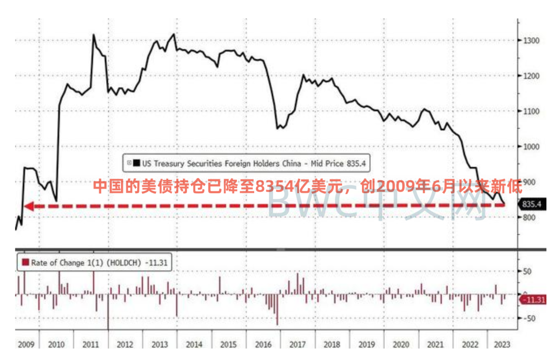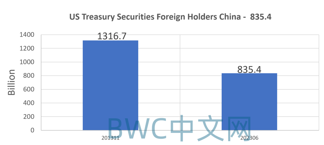不仅于此,BWC中文网国际财经团队独家查询美国财政部历史数据注意到,中国在2013年11月持有美债总额约1.3167万亿美元,与目前持仓的8354亿美元相比,中国已累计净抛售了规模高达4813亿美元的美国国债,累计净抛售比例约37%。