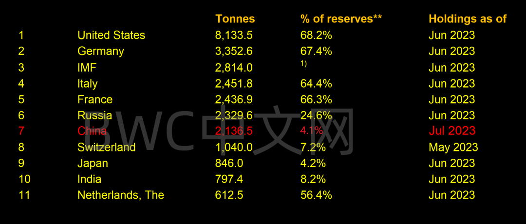 而通过下图,可以看到,相比于德法意等欧洲国家黄金储备占外储比例高达65%以上来看,中国目前的黄金储备占外储比例仅约为4.1%。